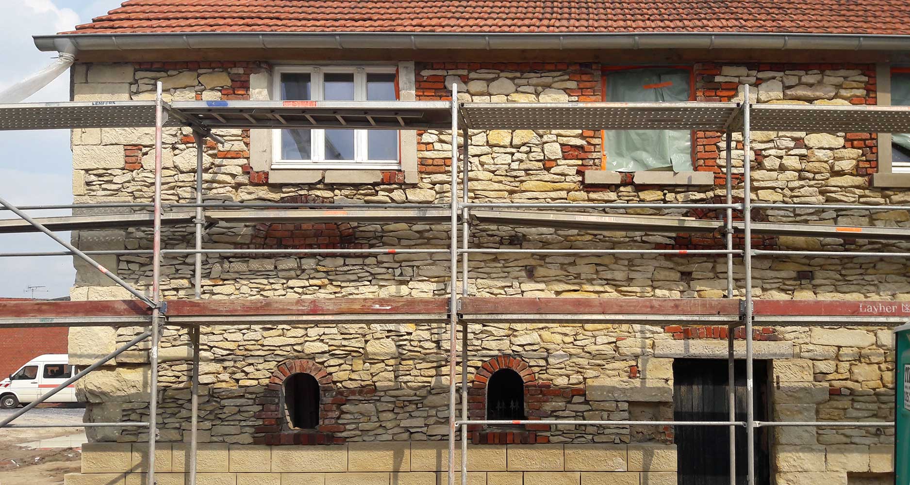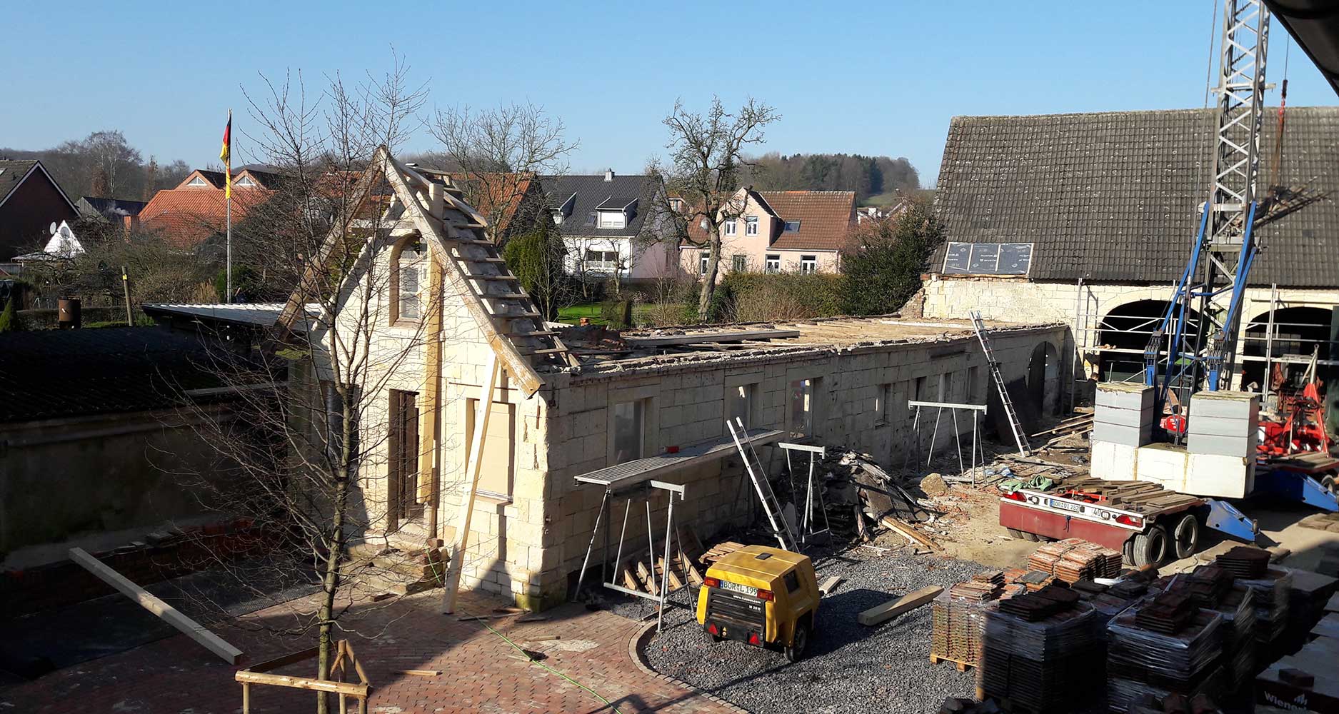 Nach einem Sturm im Januar 2018 steht fest, dass das Dach des „Schweinehauses“ einsturzgefährdet ist und runter muss. Danach kam erstmal Baustop. Es war zunächst unklar, ob das auf der Grundstücksgrenze stehende Gebäude überhaupt wieder aufgebaut werden durfte.