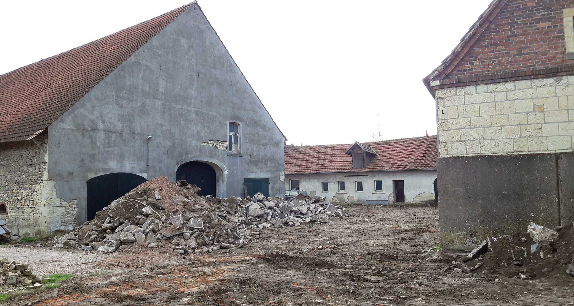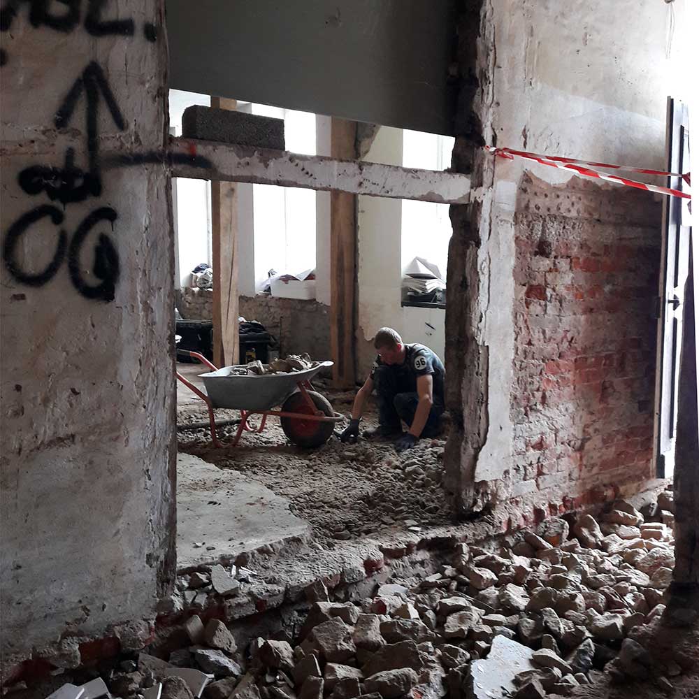 Der alte Hofbelag muss weg. Nachdem die Betonschicht zwischen den Gebäuden entfernt ist, sieht es erstmal aus wie nach einem Krieg.
