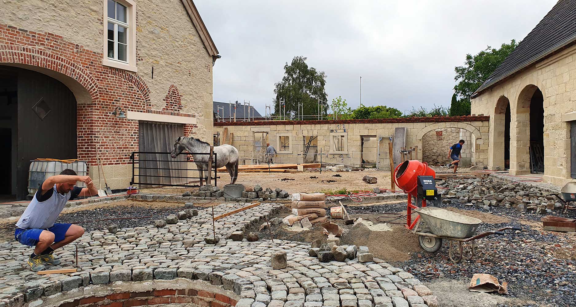 Nach seeehr viel Matsche an Füßen, Hufen und Reifen bekommt nun endlich unser Nordhof auch sein Pflaster. Wir kaufen die alten Steine von einem sanierten belgischen Marktplatz und unser Superheld Gabriel verlegt die 250.000 kg Kopfsteinpflastersteine auf dem Hof. Bis heute sind seine Arme länger als vorher …