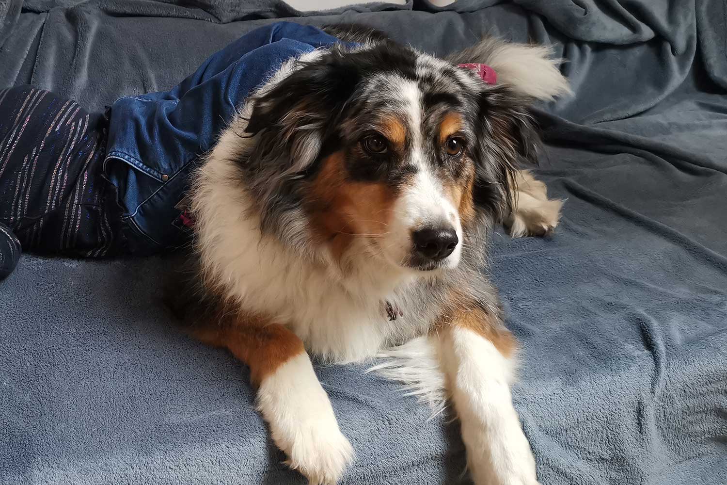 Pina lebt bei Melanie, mit der sie auch die Ausbildung zur Therapiehündin absolviert hat. Sie begleitet Melli bei ihrer Arbeit auf Gut Feismann und hat schon viele kleine Seelen betreut.