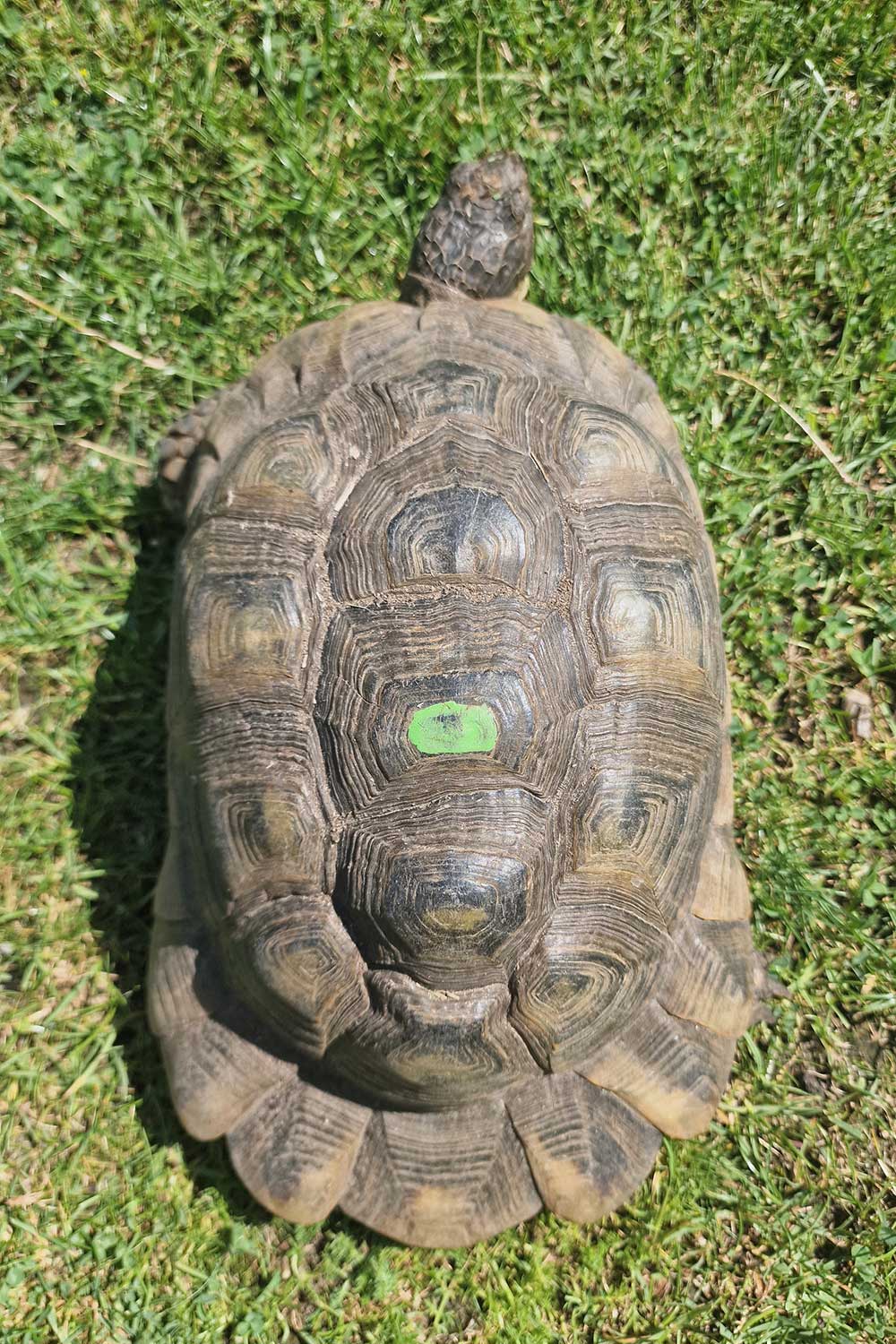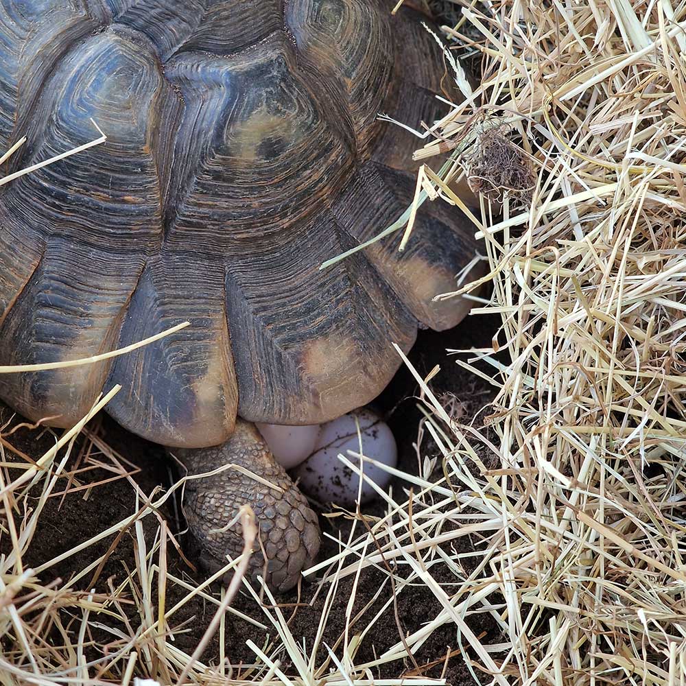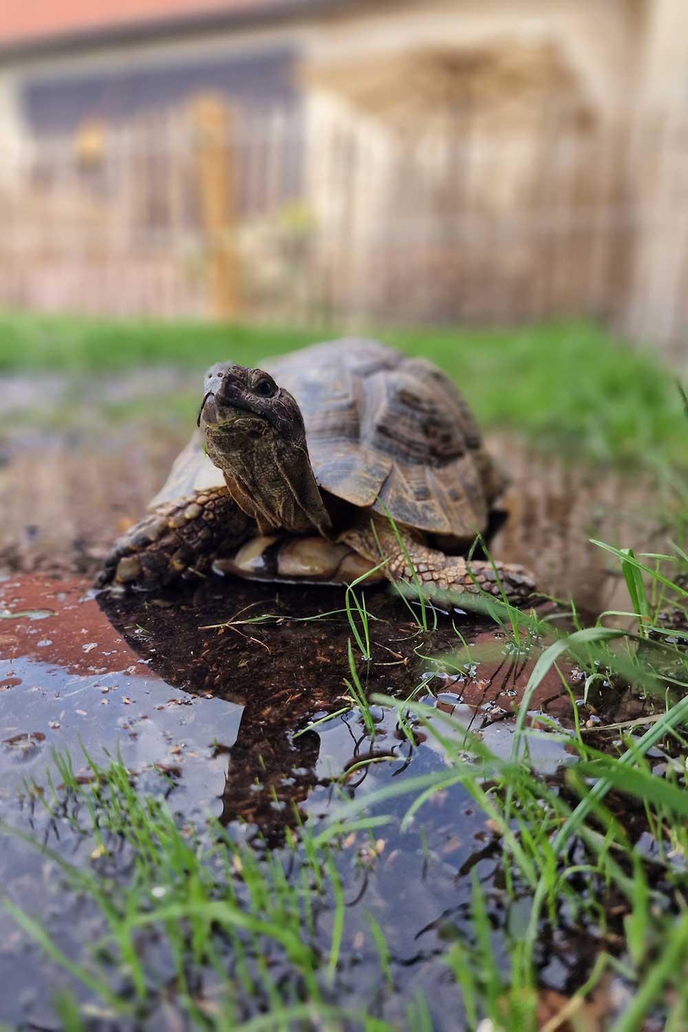 Als mein kleiner Sohn Franz aufgeregt aus der Schule kam und mir begeistert davon erzählte, dass er gerade alles über Landschildkröten gelernt hatte, war mein Verbündeter des Wunsches gefunden, auch bei uns eine Landschildkröte zu halten. Nur einen Tag darauf erfuhren wir von drei Tieren, die dringend ein neues Zuhause suchten. Wir fanden heraus, was die urigen Tiere alles brauchen, um sich wohl zu fühlen und Dietmar baute uns in Windeseile eine Schildkrötenvilla. Wir testeten mit dem robusten Schildkrötenmann Elvis, ob seine Spezies mit allen anderen Tieren verträglich ist und bald darauf zogen die uralte Morla, Frau Deckenhoff und Ostwind bei uns ein. Immer mal wieder kommen seither krötige Sommergäste zu uns, da sich unser kombinierter Schaf-, Hasen- und Schildkrötengarten besonders für die kauzigen Bewohner eignet und sich alle sehr wohl fühlen. Es ist wirklich ein besonderes Erlebnis, die Kröten bei ihrer Wanderung zu beobachten. Wir alle werden immer wieder in ihren Bann gezogen und erfahren Entspannung vom Alltag durch unsere gepanzerten Freunde. Übrigens: Die Mädels legen bis zu 30 Eier im Jahr. Diese pingpongballartigen Gebilde bereichern unseren Speiseplan und geben mit den Geflügeleiern ein interessantes Bild ab.