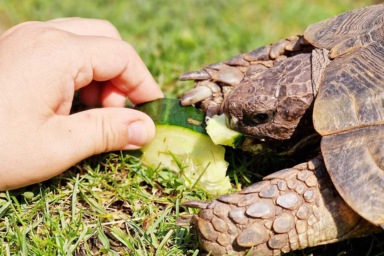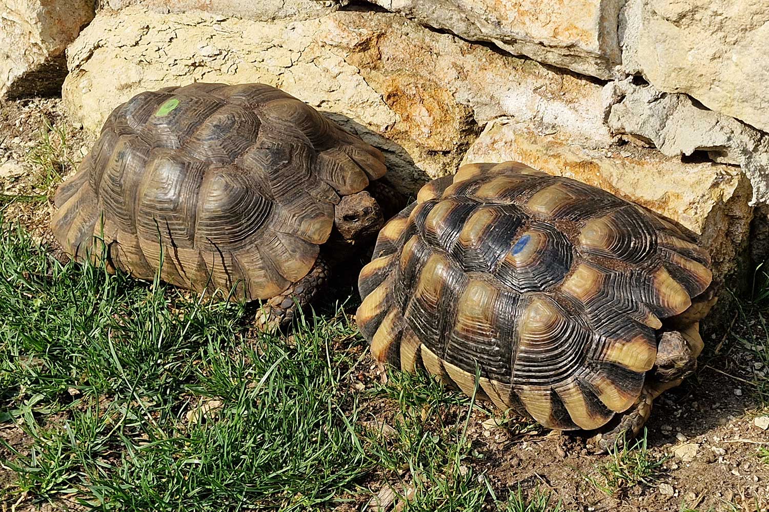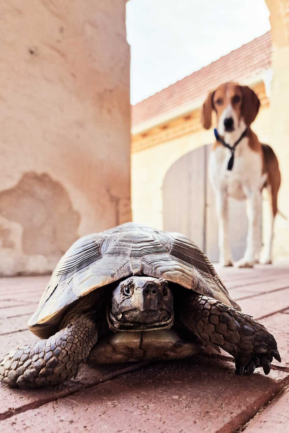 Als mein kleiner Sohn Franz aufgeregt aus der Schule kam und mir begeistert davon erzählte, dass er gerade alles über Landschildkröten gelernt hatte, war mein Verbündeter des Wunsches gefunden, auch bei uns eine Landschildkröte zu halten. Nur einen Tag darauf erfuhren wir von drei Tieren, die dringend ein neues Zuhause suchten. Wir fanden heraus, was die urigen Tiere alles brauchen, um sich wohl zu fühlen und Dietmar baute uns in Windeseile eine Schildkrötenvilla. Wir testeten mit dem robusten Schildkrötenmann Elvis, ob seine Spezies mit allen anderen Tieren verträglich ist und bald darauf zogen die uralte Morla, Frau Deckenhoff und Ostwind bei uns ein. Immer mal wieder kommen seither krötige Sommergäste zu uns, da sich unser kombinierter Schaf-, Hasen- und Schildkrötengarten besonders für die kauzigen Bewohner eignet und sich alle sehr wohl fühlen. Es ist wirklich ein besonderes Erlebnis, die Kröten bei ihrer Wanderung zu beobachten. Wir alle werden immer wieder in ihren Bann gezogen und erfahren Entspannung vom Alltag durch unsere gepanzerten Freunde. Übrigens: Die Mädels legen bis zu 30 Eier im Jahr. Diese pingpongballartigen Gebilde bereichern unseren Speiseplan und geben mit den Geflügeleiern ein interessantes Bild ab.