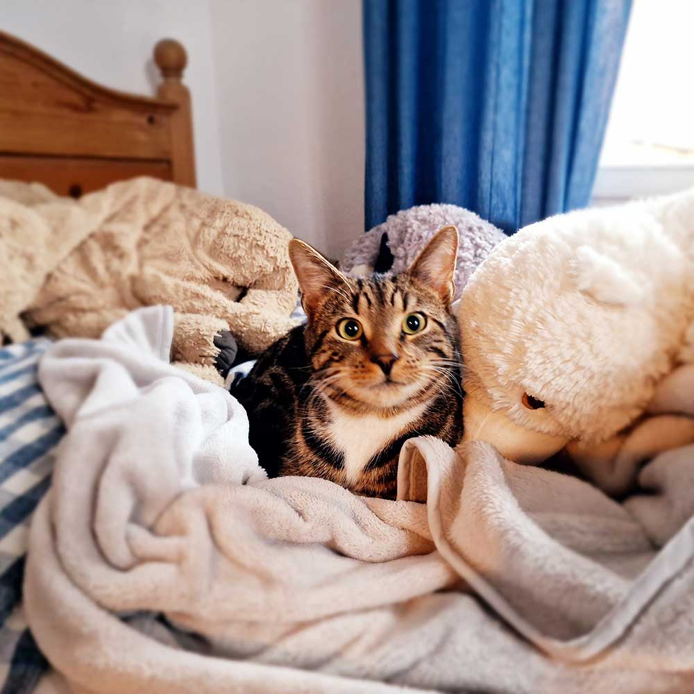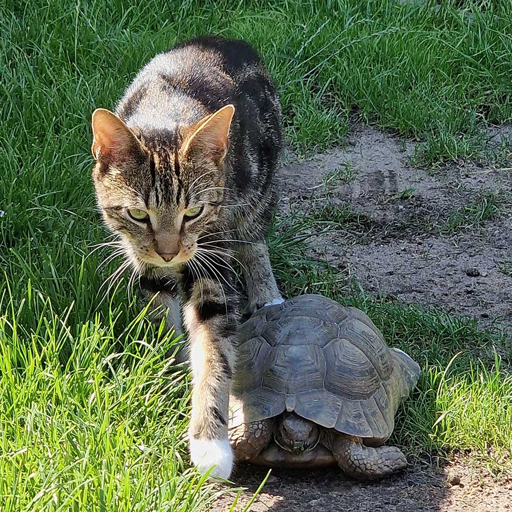Auf Gut Feismann lebt mit uns unser Kater Toni. Toni sorgt zuverlässig dafür, dass wir kaum eine (lebende) Maus zu Gesicht bekommen. Darüber hinaus ist Toni ein echter Schmusekater mit viel Geduld, besonders für Kinder. Wie wir ihn mit unserem großen Jagdhund Leinemann zusammenbringen sollten, stellte uns bei seinem Einzug vor ein Rätsel. Die Lösung wurde schnell klar: Toni ist der Boss, macht die Ansagen und hat Leinemann im Handumdrehen um den Finger, pardon, um die Pfote gewickelt. Heute schlafen beide in einem Körbchen und sind ein hinreißendes ungleiches Paar.