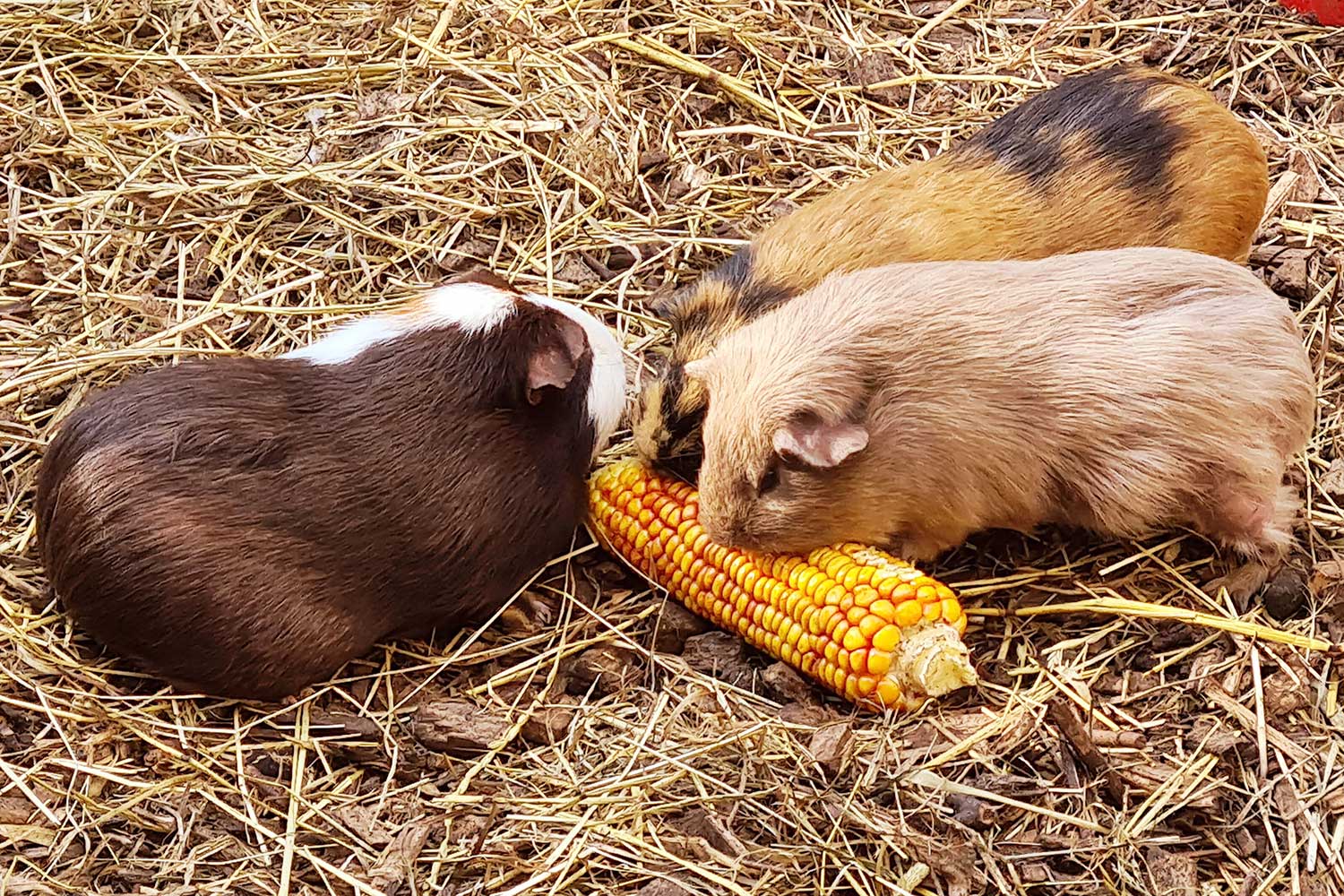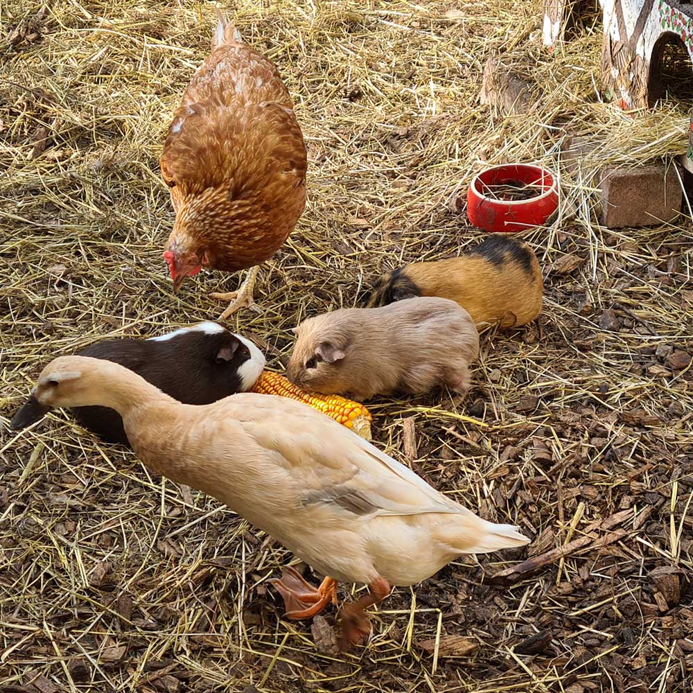 Unsere zauberhafte Meerschweinchenherde und die beiden deutschen Riesenkaninchen Olaf und Anna beflügeln unsere kleinen Gäste auf ganz besondere Weise. Sie sind nicht die klassischen Schmusetiere sondern dienen dazu, eine Umgebung zu schaffen, in der sich besonders aufgeregte, schmerzgeplagte oder krampfende Kinder auf erstaunliche Weise entspannen und fokussieren. Oft legen wir Kinder auf ein Heubett zu den Tieren und warten mit viel Ruhe und Geduld gemeinsam ab, bis die kleinen Wesen zu uns kommen. Wenn dann zarte Schnurrhaare die Haut der Kinder ertasten, beginnt ein magisches Erleben.